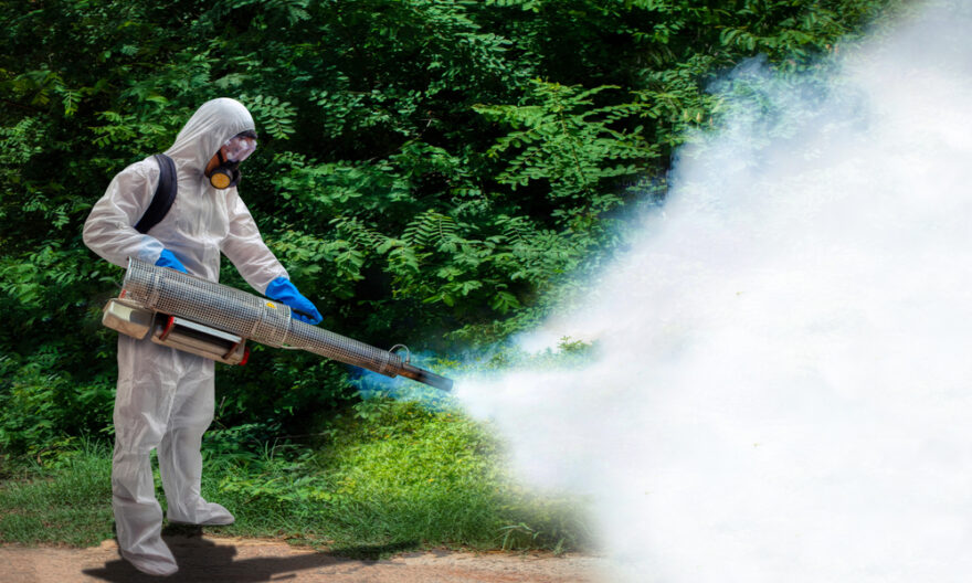 Insecticide is pumped up in the air by a technician using an insecticide fogging device. The fog drapes leaves, open surfaces, and consequently mosquito habitats. At this point in the application’s timing, fog kills any adult mosquitoes present.